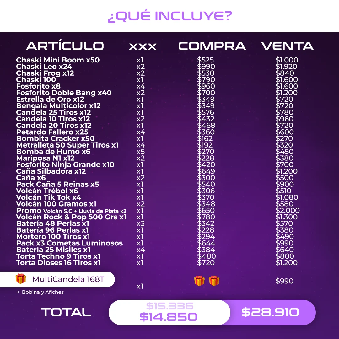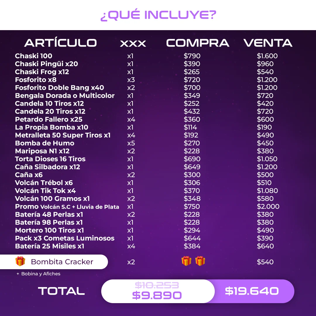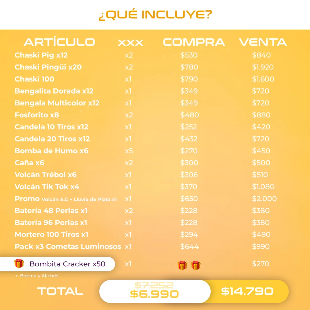 Los Packs Kiosko traen todo lo que necesitás para revender fuegos artificiales de forma fácil y segura. Cada pack viene armado con productos seleccionados, listos para exhibir, con precios de reventa sugeridos y regalos incluidos