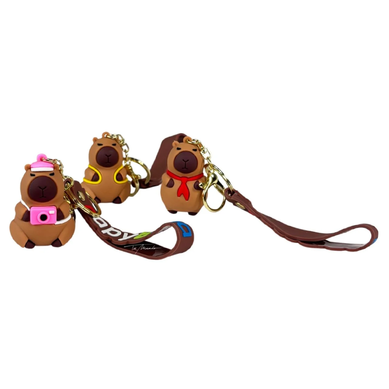 Este llavero tiene una figura de capibara con mini cámara rosa, cinta de goma colorida con la palabra “capybara” y gancho metálico para colgarlo donde quieras. Perfecto para mochilas, estuches, carteras o llaves.
