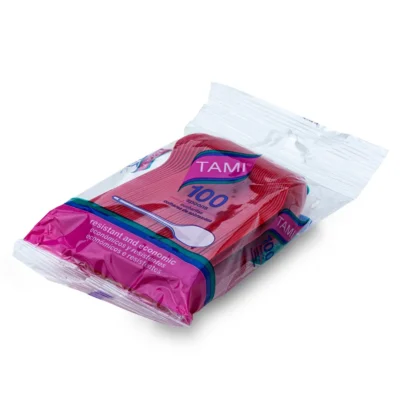 Cucharitas plásticas Tami blancas de 11 cm, resistentes y prácticas. Pack económico de 100 unidades, ideal para cumpleaños, eventos y servicio de postres.