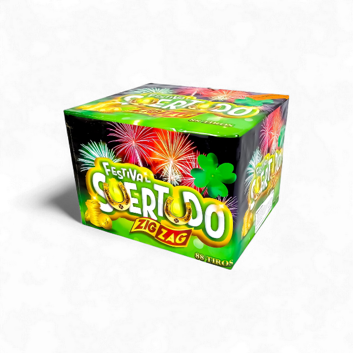 Festival Suertudo – 88 Tiros. Diseño armónico con destellos dorados y rojos. Efecto medio y excelente relación duración/intensidad.