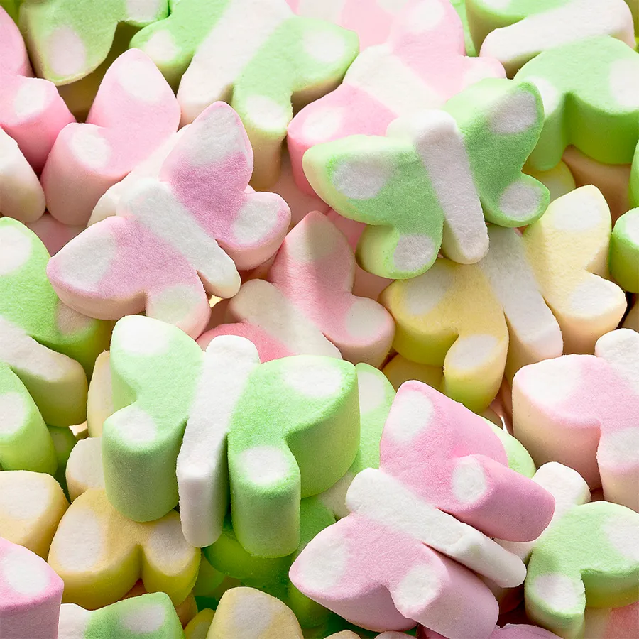 Coloridos marshmallows FINI en forma de mariposa, dulces y esponjosos para alegrar tu mesa de fiesta.