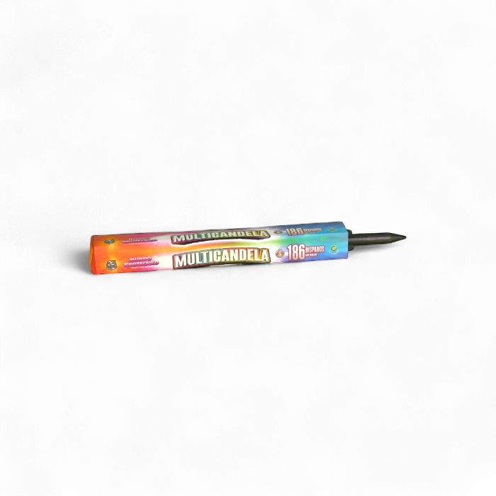 La Multicandela 186 Tiros Edición 2025 combina efectos verde, rojo, azul, amarillo y glitter blanco para un espectáculo visual completo y moderno.
