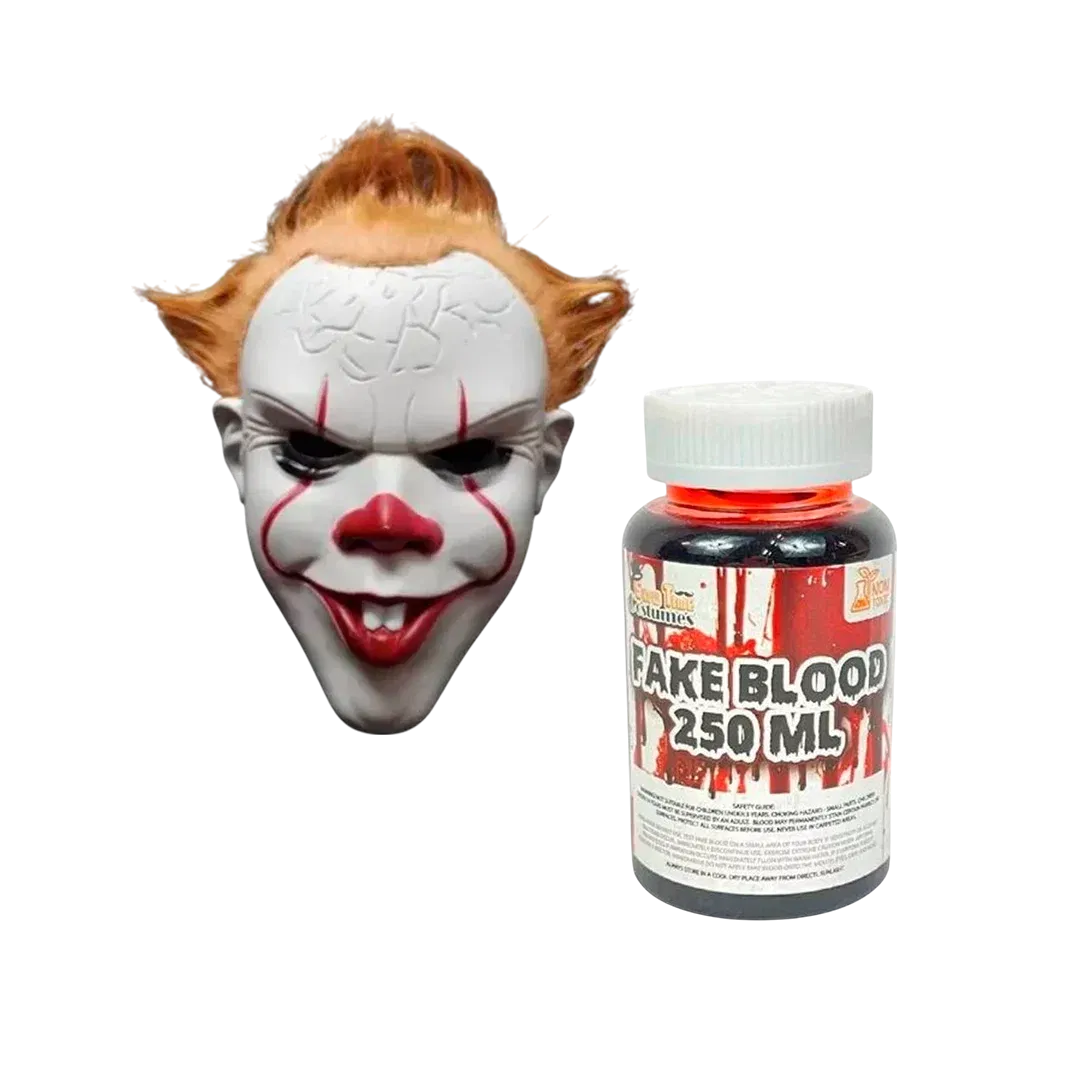 La Promo Noche Sangrienta es para los más atrevidos del Halloween. Incluye la máscara de payaso IT, con detalles que generan verdadero terror, y un frasco grande de sangre falsa de 250 ml, suficiente para lograr efectos impactantes en la piel, el rostro o la ropa. Es el combo perfecto para quienes quieren ser protagonistas de la noche, ya sea en una fiesta de disfraces, un show escolar o un evento temático. La combinación de máscara y sangre asegura un look inolvidable, de esos que nadie se anima a olvidar. ¡Ideal para fanáticos del terror extremo!