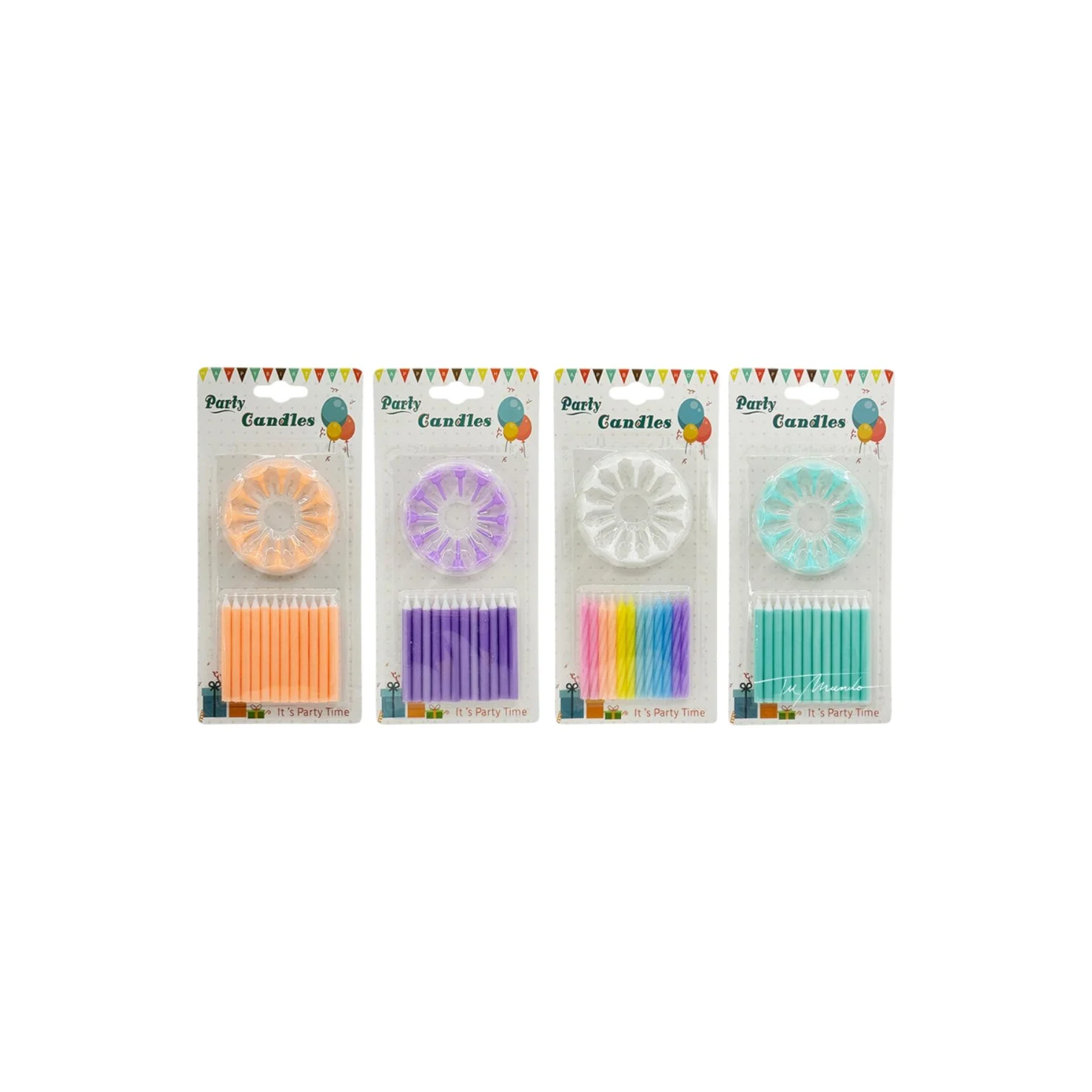 Este set incluye 12 velas de cumpleaños de 6 cm con base decorativa en forma de flor o pastel. Ideal para mantener las velas firmes en la torta y sumar un toque de diseño.
